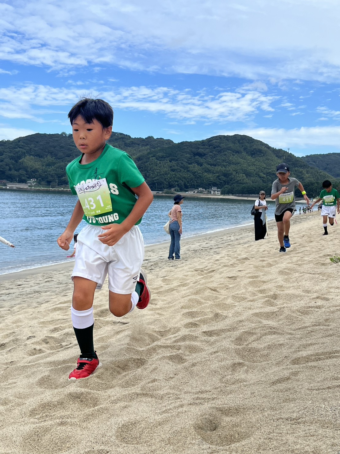 子供達が出場した「砂浜キッズラン」は、いつものグラウンドとは違い約1.2キロの砂浜を走る大会。砂に足を取られながらでも最後まで諦めず走る姿や、思うような成績が出せず悔しがる子供がいたりと、微笑ましい光景がみられました。