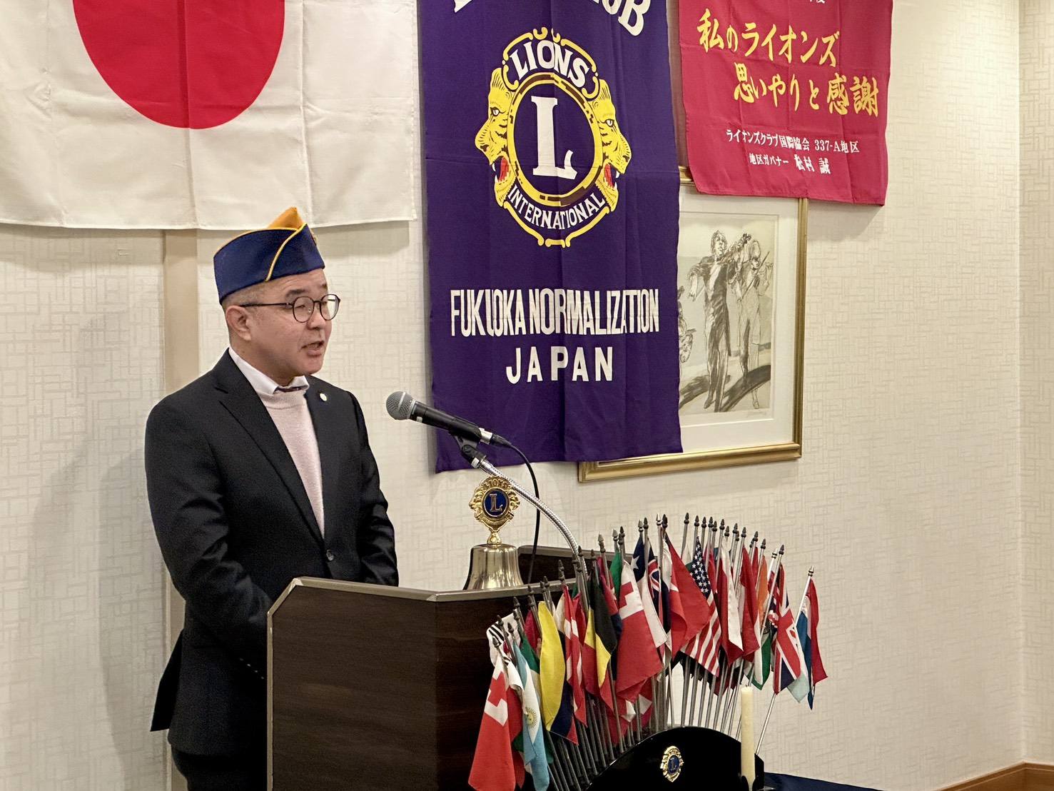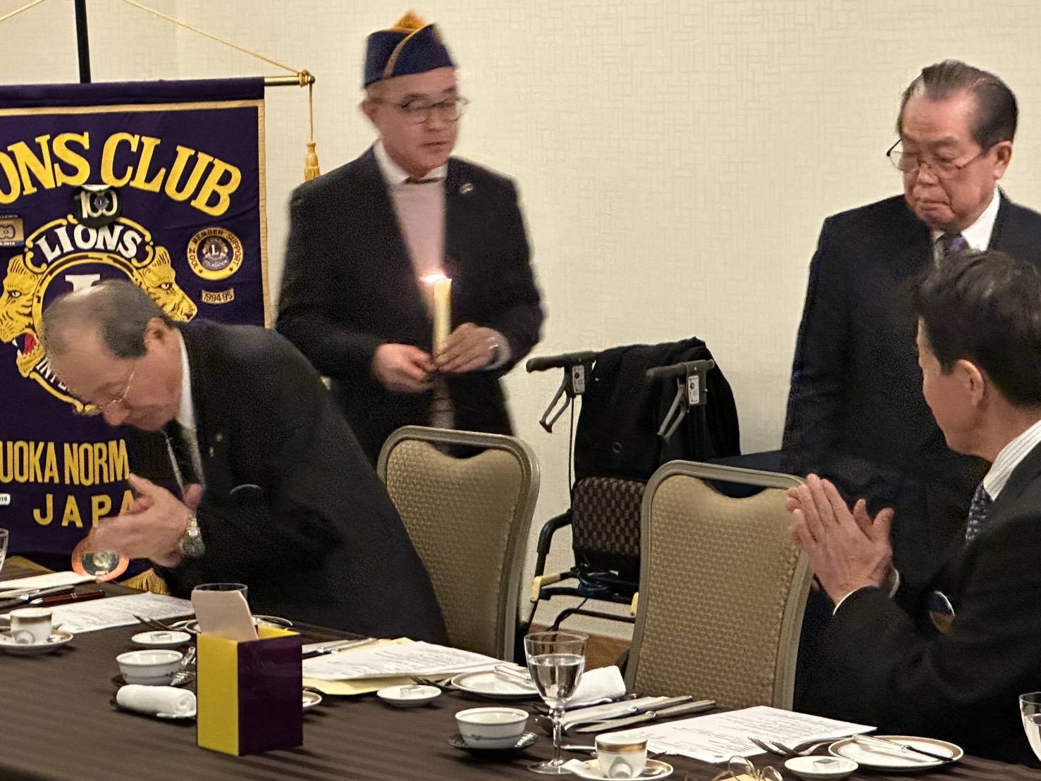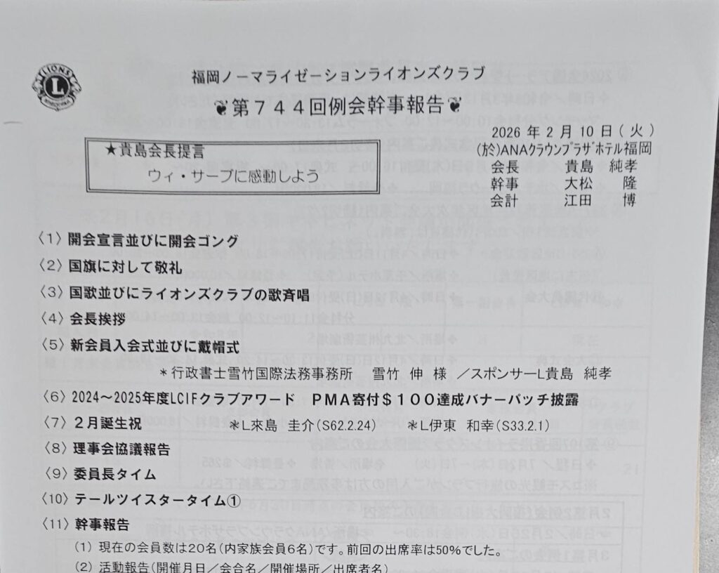 福岡NOZLC例会2026年2月10日(火)ANAクラウンプラザホテル福岡 福岡ノーマライゼーションLC 第744回例会 報告 第744回例会が、2月10日12時~ANAホテル福岡にて行われました。 11時~理事会、12時~例会が開かれ、L雪竹信(スポンサーL貴島)の嬉しい入会式が、L関口会員委員長の進行で、タイピン、戴帽、キャドルサービス、L雪竹誓いの言葉や自己紹介などで厳かに行われました。 報告、貴島純孝