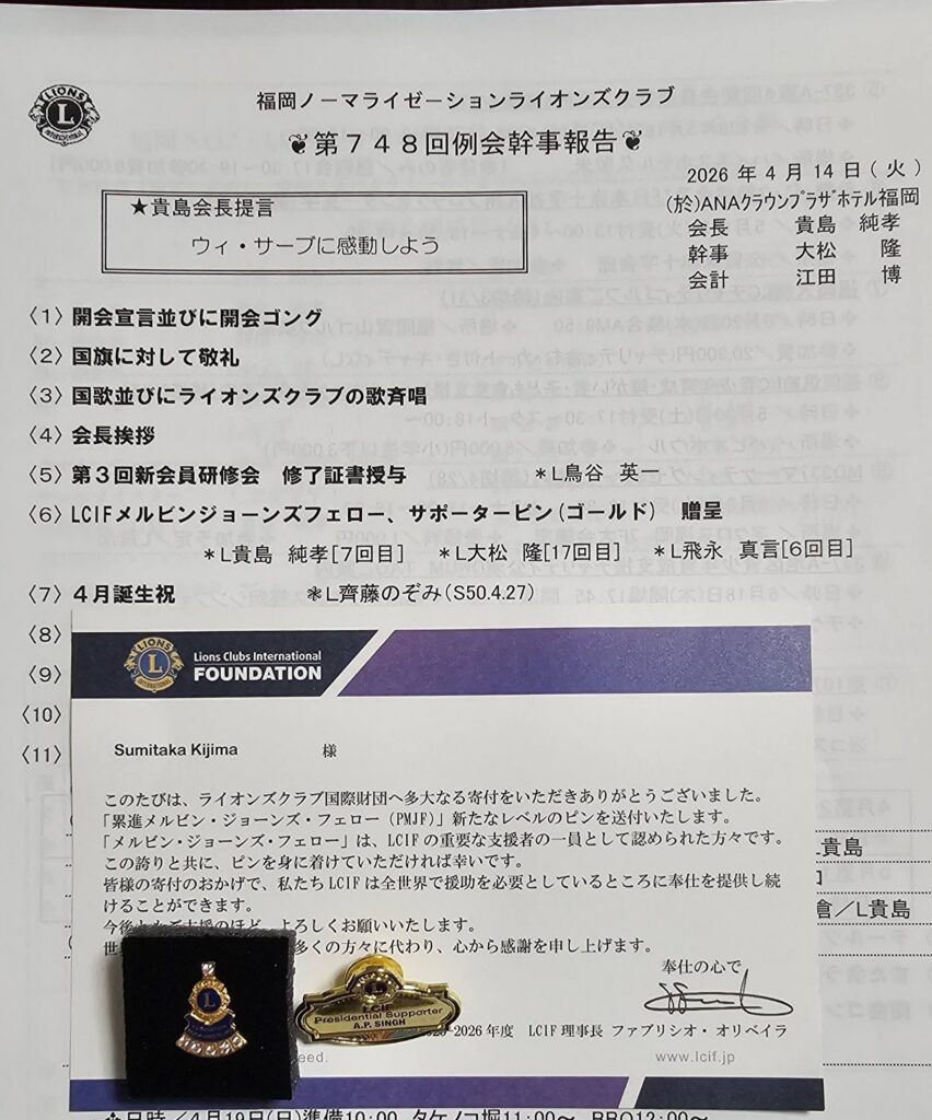 第748回例会が4月14日12時~ANAクラウンプラザホテル福岡で開催されました。