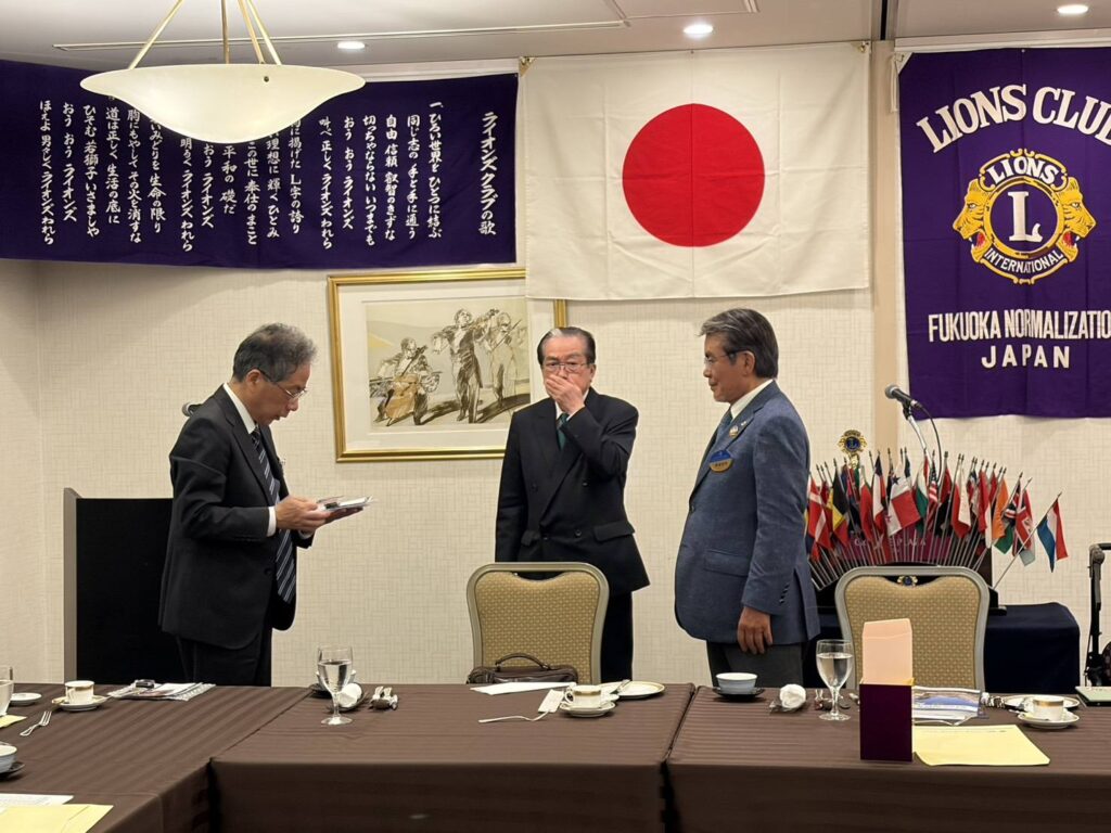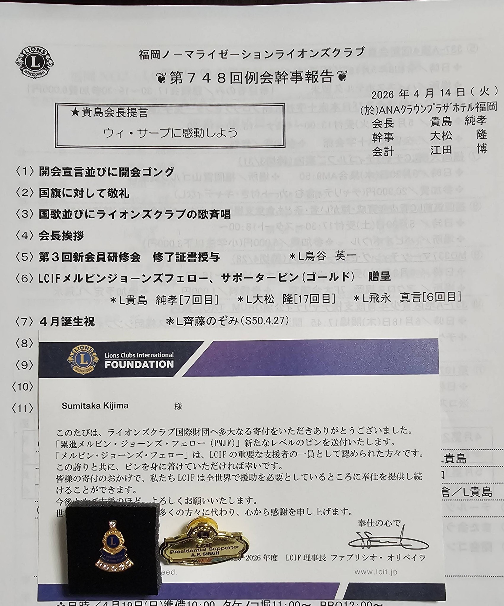 LCIFメルビージョンフエローピンとサポーターピンが、前会長L関口より、L貴島(7回目)L大松(17回目)欠席のL飛永(6回目)に贈られました。